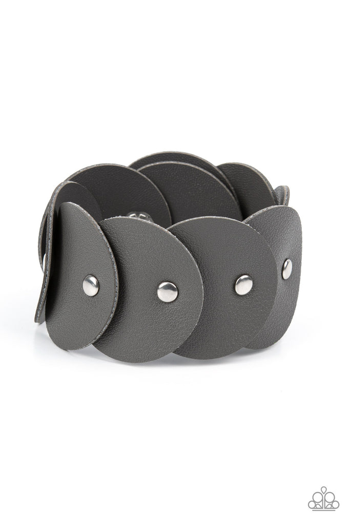 Overlapping gray leather discs are studded in place around the wrist, resulting in a dizzying rustic centerpiece. Features an adjustable snap closure.