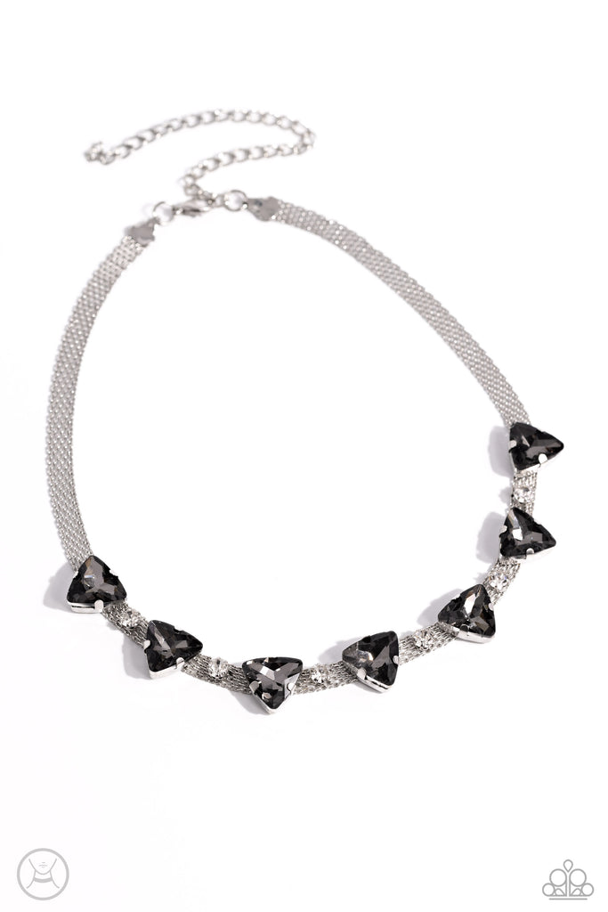 Suspended from two silver fittings, a shimmery cascade of dainty silver chains layer around the collar for an industrial statement. Infused amongst the industrial strands, a collection of pronged white gems alternate with pronged smoky triangular gems for a touch of gritty color. Features an adjustable clasp closure.