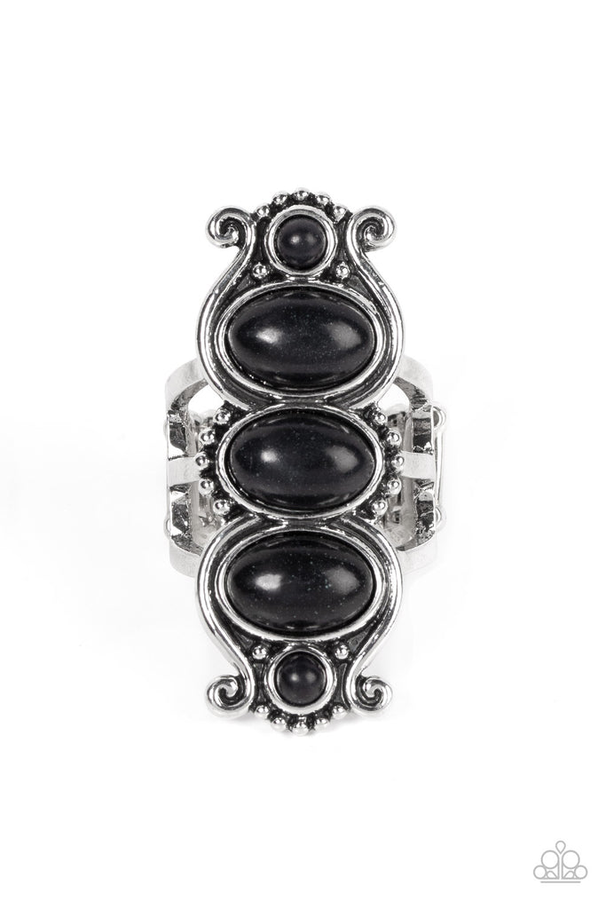 Flanked by dainty black stones, a trio of oval black stones stack vertically down the finger. Antiqued silver bars and studded details whirl around the stone centerpiece, adding authentic texture to the seasonal centerpiece. Features a stretchy band for a flexible fit.