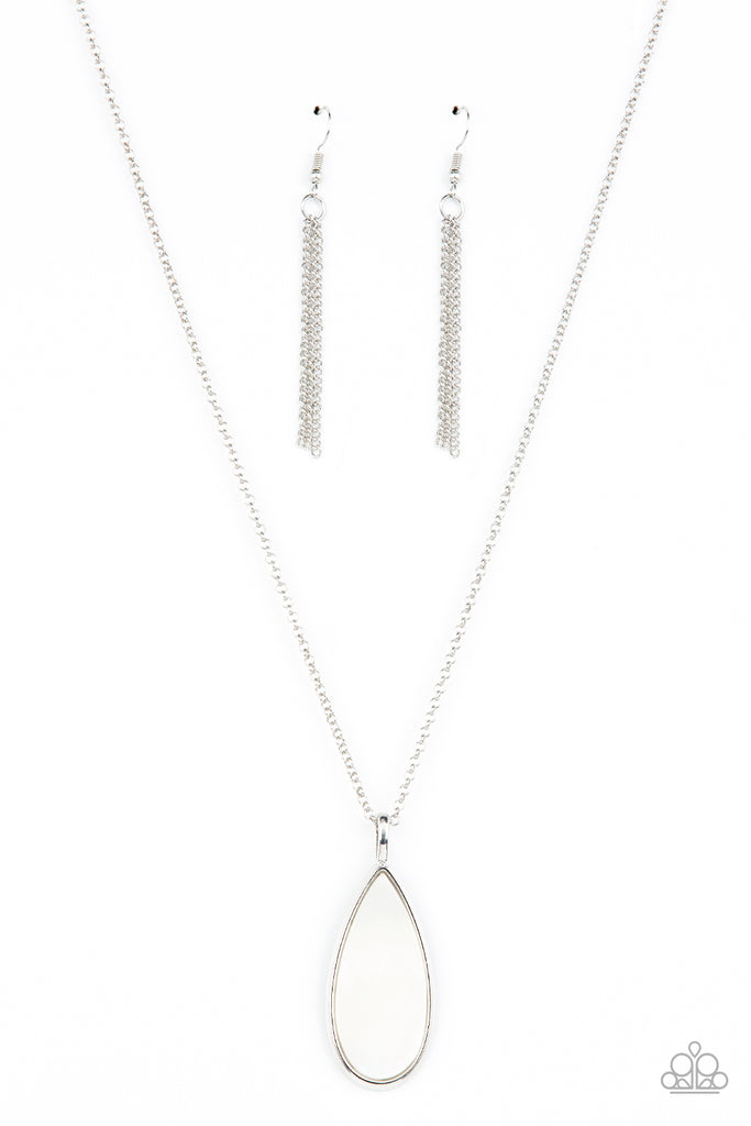 Encased in a sleek silver fitting, a white shell-like teardrop pendant swings from the bottom of an elegantly extended silver chain for a refined look. Features an adjustable clasp closure.
