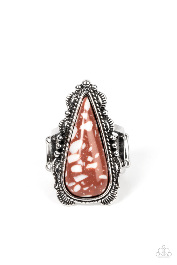 An oversized and speckled brown teardrop stone is nestled inside a silver frame studded and embellished in antiqued silver details for an authentic finish. Features a stretchy band for a flexible fit.