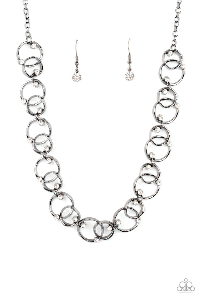 Sporadically dotted in glassy white rhinestones, asymmetrical pairs of overlapping gunmetal rings delicately link below the collar for a dizzying display of industrial refinement. Features an adjustable clasp closure.