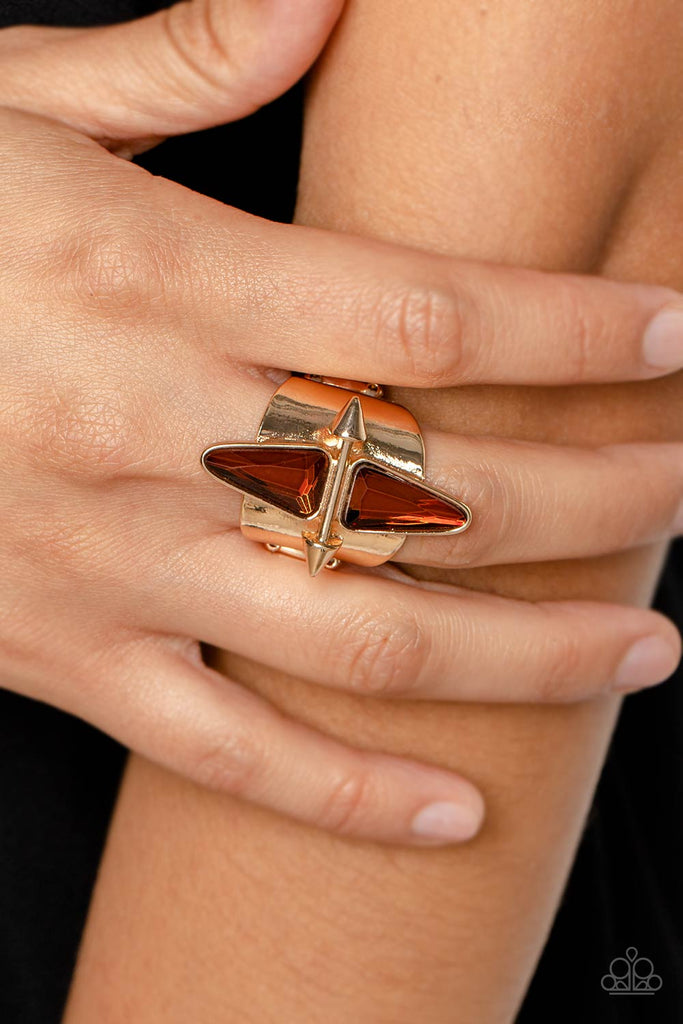 Set into elongated, triangular gold frames, chiseled pieces of tea gems shimmer atop a thick band of gold that curves around the finger. Separating the two prominent points, a two-tipped, dainty gold spear completes the compass-like centerpiece for an edgy statement. Features a stretchy band for a flexible fit.