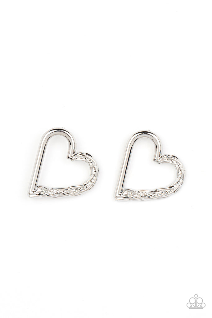 One side of a glistening silver heart frame is subtlety twisted with twinkly texture, creating a romantic display. Earring attaches to a standard post fitting.