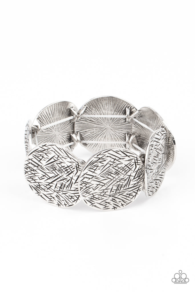 Etched in antiqued scratched textures, beveled silver discs delicately overlap along a stretchy band around the wrist for an oversized pop of metallic shimmer.