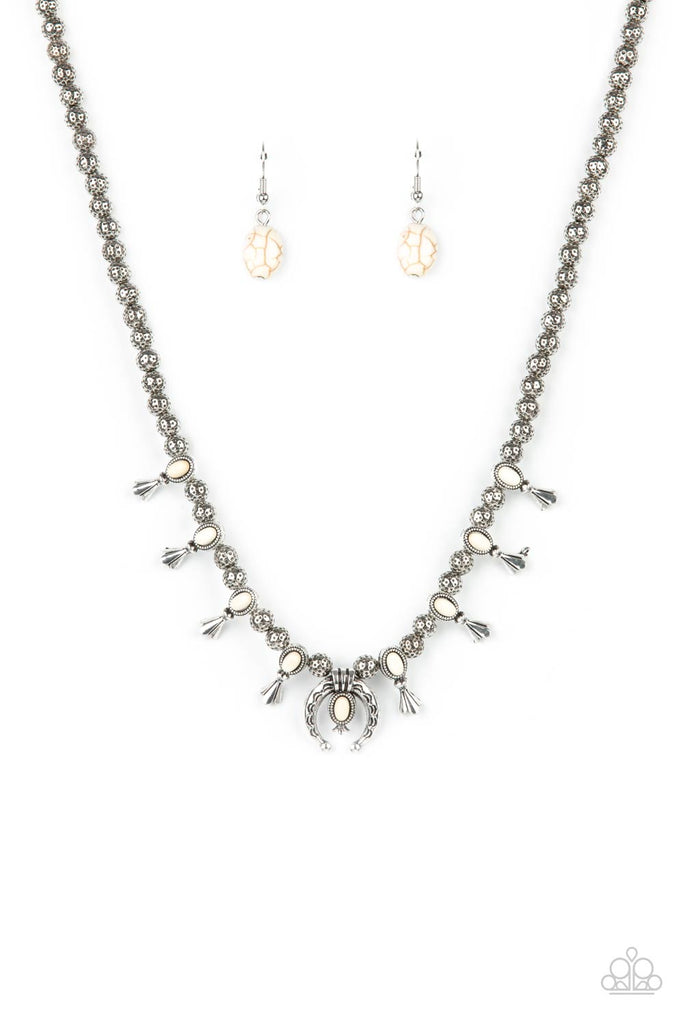 Small white stones pressed into oval frames accented with silver flutes fan out across the collar in a timeless display. An embossed silver horseshoe encircles a white stone for a lucky finish. Features an adjustable clasp closure.