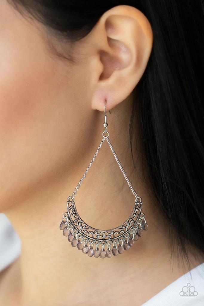Suspended by two silver chains, a half moon silver frame filled with vine-like filigree gives way to a dainty fringe of glassy gray teardrop beads for an enchanting fashion. Earring attaches to a standard fishhook fitting.