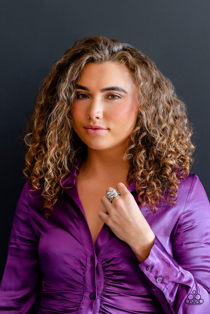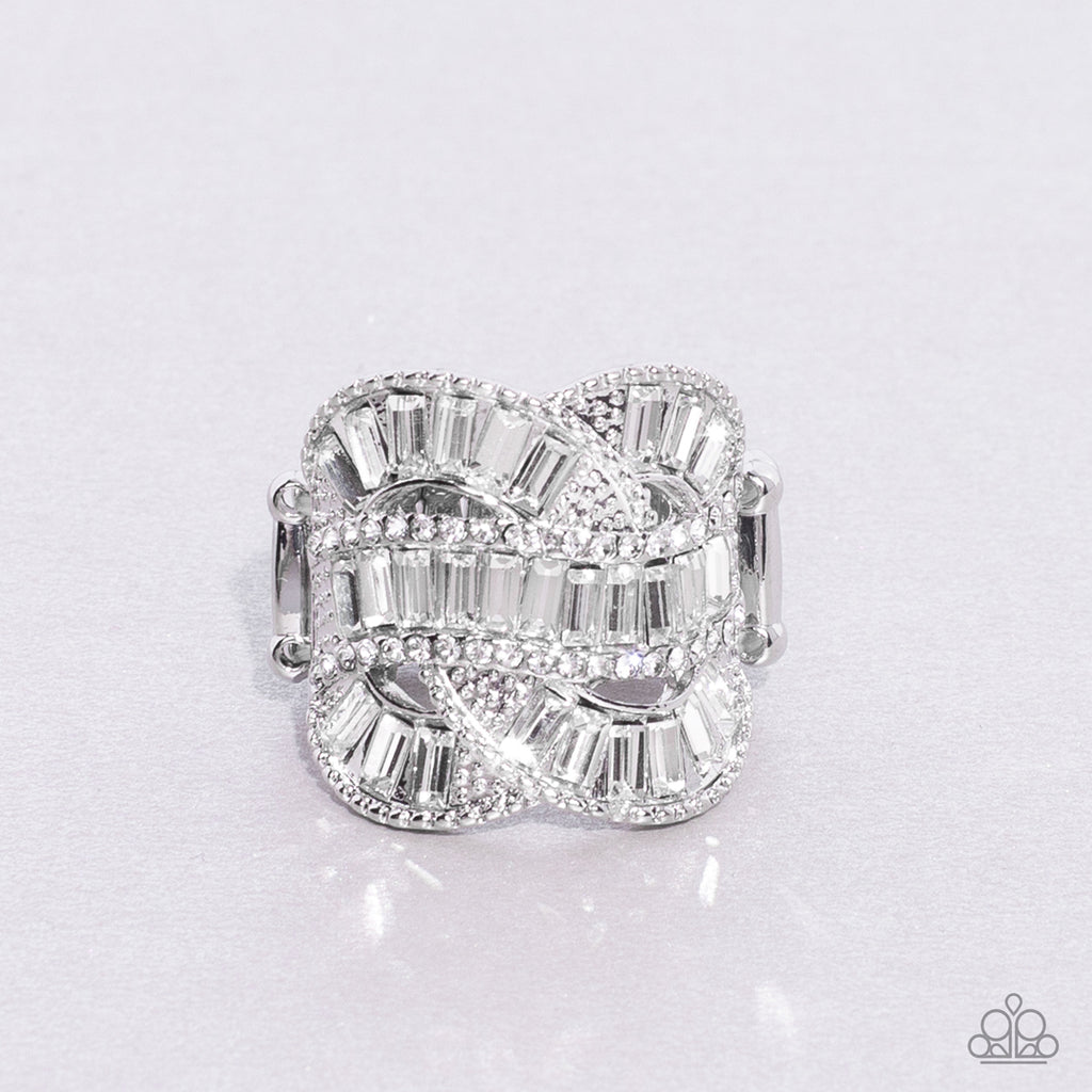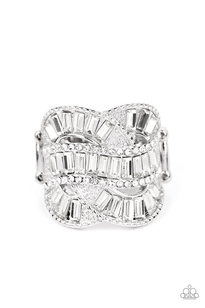 Rich white rhinestones, chiseled into dramatic emerald-cuts, fall in line along twisting bands of silver. Tiny white rhinestones border the top and bottom edges of the swirling silver bands, emphasizing the shimmer as they interlock across the top of the finger. Features a stretchy band for a flexible fit.